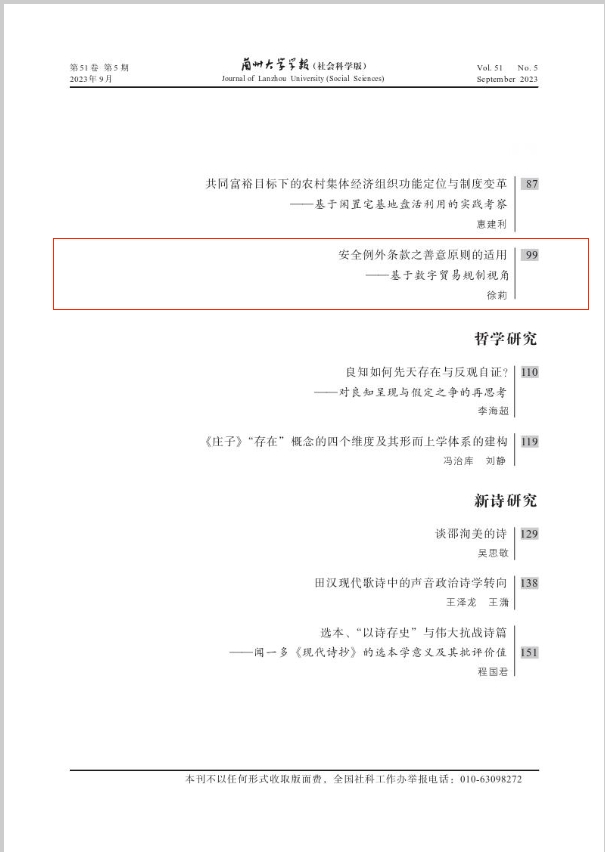 近日,437必赢会员中心法学院副教授徐莉在《兰州大学学报(社会科学版)》(CSSCI来源期刊)2023年第5期发表论文《安全例外条款之善意原则的适用——基于数字贸易规制视角》。