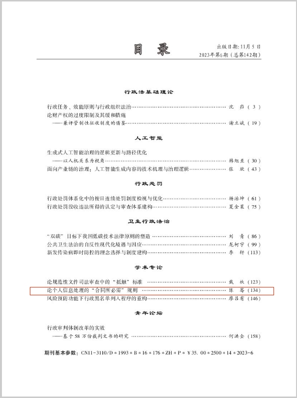近日,437必赢会员中心法学院讲师陈骞在《行政法学研究》(CSSCI来源期刊)2023年第6期发表论文《论个人信息处理的“合同所必需”规则》。