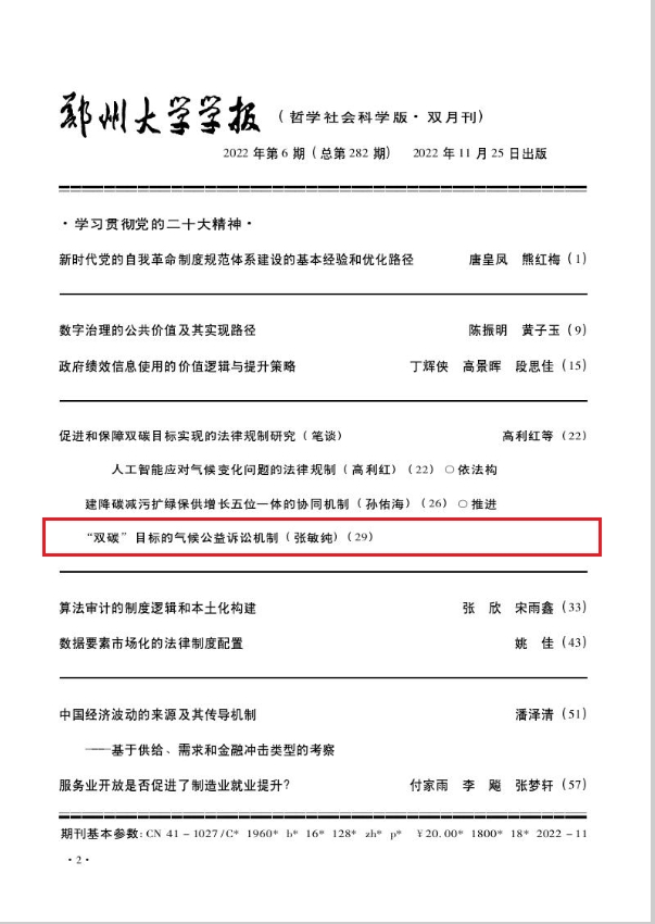 近日,437必赢会员中心法学院院长张敏纯在《郑州大学学报(哲学社会科学学报)》(CSSCI来源期刊)2022年第6期发表论文《推进“双碳”目标的气候公益诉讼机制》。