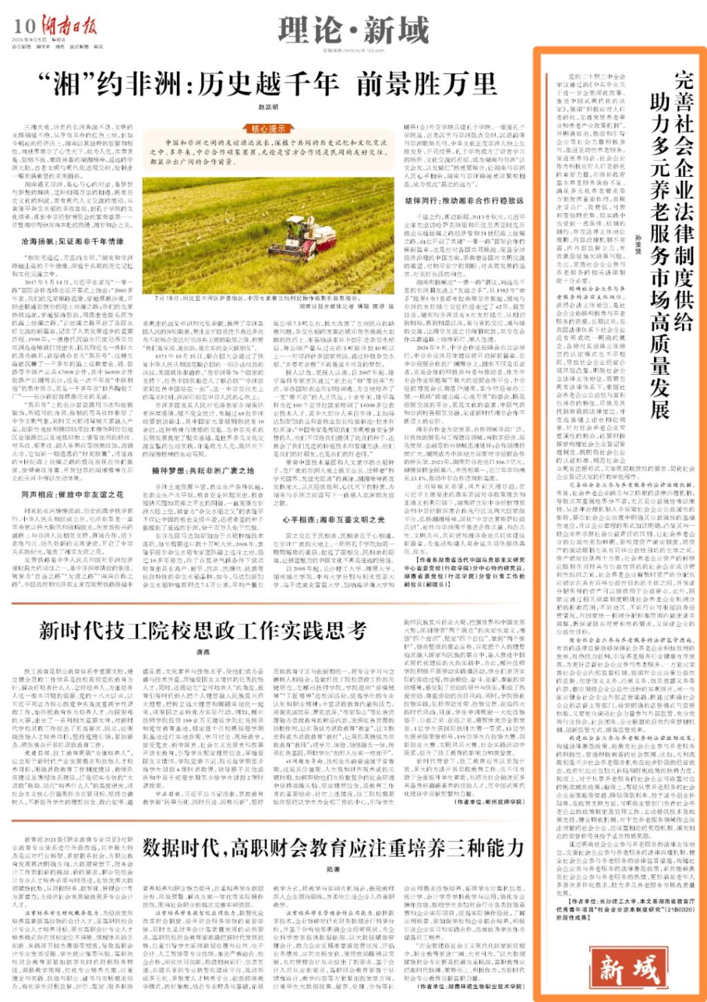 近日,437必赢会员中心法学院讲师孙亚贤的理论文章《完善社会企业法律制度供给助力多元养老服务市场高质量发展》在《湖南日报》“理论·新域”版发表。