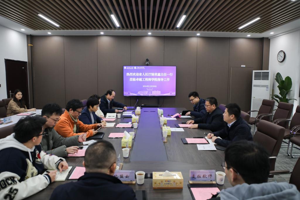 12月26日下午,湖南省人力资源和社会保障厅就业服务中心党委书记、主任陈荣鑫、创业服务部部长毛彪、创业服务部二级主任科员胡川一行组成调研组来到必赢官网,就大学生创业孵化基地进行实地调研。校党委书记付宏渊陪同调研。湘江卓越工程师学院负责人参加调研和座谈。