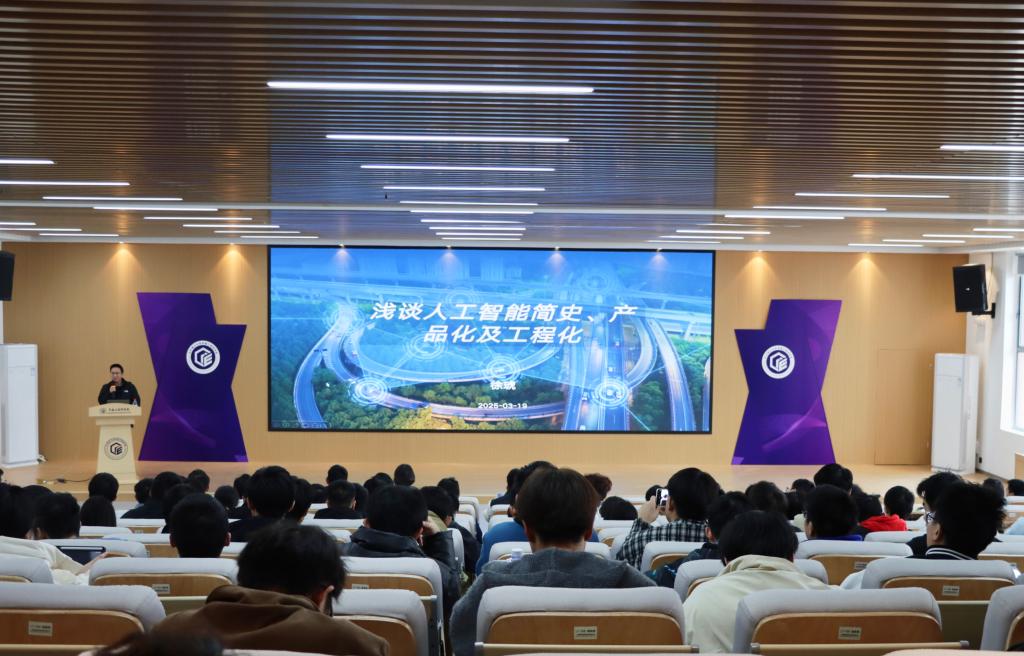 徐琥博士以《浅谈人工智能简史、产品化及工程化》为题展开讲述。讲座伊始,徐琥以幽默风趣的语言引入人工智能这一前沿科技领域,深入浅出地阐述了人工智能的定义。他指出,人工智能旨在让机器具备人类的智能,涵盖感知、学习、认知三大能力,并用清晰的时间线串联起人工智能发展的重要节点。结合具体案例,他帮助同学们理解并区分何为产品化思维与工程化思维,告知大家产品化思维要求关注市场需求,以用户为中心打造完整、可行的产品;工程化则注重解决问题、做成产品,追求最后1%的完美。他以自动驾驶的核心技术为例,详细介绍了其分类、硬件架构、核心技术以及产品特点,使同学们对人工智能在实际应用中的复杂性和挑战有了更深刻的认识。