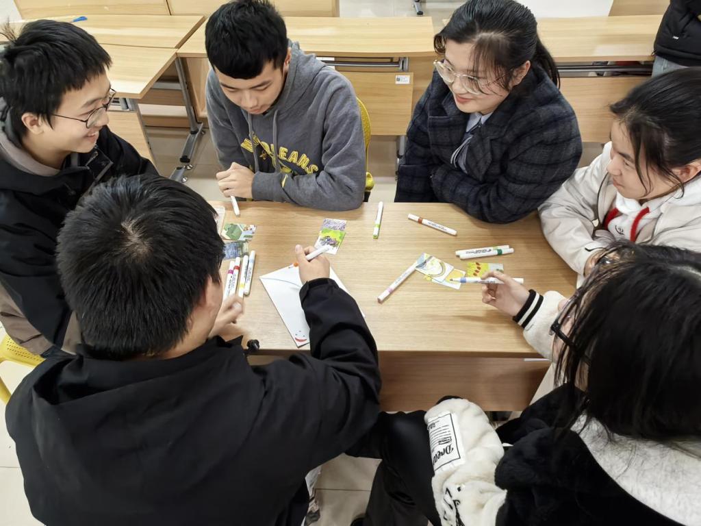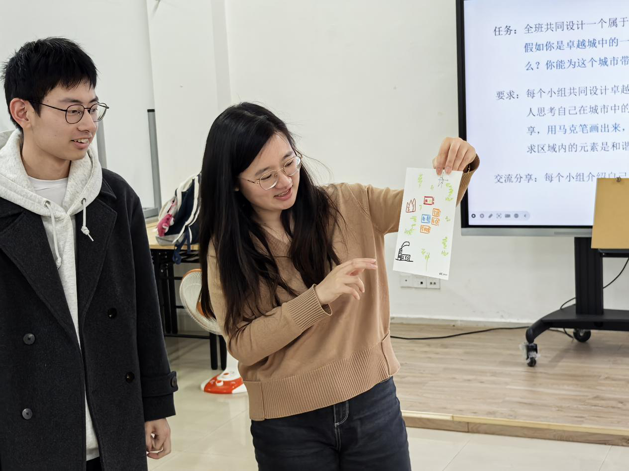 活动伊始,曾玮怡通过指导方言接龙,帮助同学们快速破冰、建立信任、放松心灵。杨宁指导同学们通过抽取卡牌随机分为四组,新颖的分组形式迅速点燃了现场气氛。随后,三个精心设计的游戏环节层层推进。“姓名大作战”游戏中,每两组间互相比拼,通过抢答方式说出对方的籍贯加姓名,在笑声与掌声中,初见的陌生感逐渐消散,彼此之间更加熟悉。在“你画我猜”的游戏中,每组派代表用肢体语言演绎抽象数字,队友需协作破解,每两组在比拼过程中表现出较高的积极性,夸张的表演与默契的配合将活动推向高潮。在团辅最后,“共筑卓越城”环节,各组领取画笔与画纸,围绕“卓越”主题自由创作属于小组自己的城市蓝图,有的小组描绘科技感十足的交通网络,有的则勾勒绿意盎然的生态社区,展现出多元的创造力。