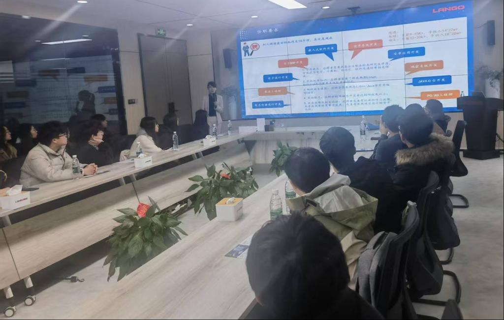 在人力总监余珊珊的引导下,师生一行参观了公司的办公环境,深入了解了公司的发展历程、企业文化以及核心业务。随后,宣讲会正式开始。余珊珊详细介绍了朗国科技的公司概况、人才需求、薪资福利以及职业发展路径等内容,使同学们对企业有了更全面的认识。宣讲结束后,同学们根据自身情况,将简历投递至相应岗位。根据岗位要求,公司组织学生们进行了线上专业笔试。下午,通过笔试的同学依次参加了HR面试、专业面试以及终面。在面试过程中,同学们积极展示自身的专业能力和综合素质。面试结束后,公司招聘负责人与师生进行了沟通,对学生递交的简历及面试情况进行了现场点评与面试指导,帮助学生提升面试技巧,增强求职信心。