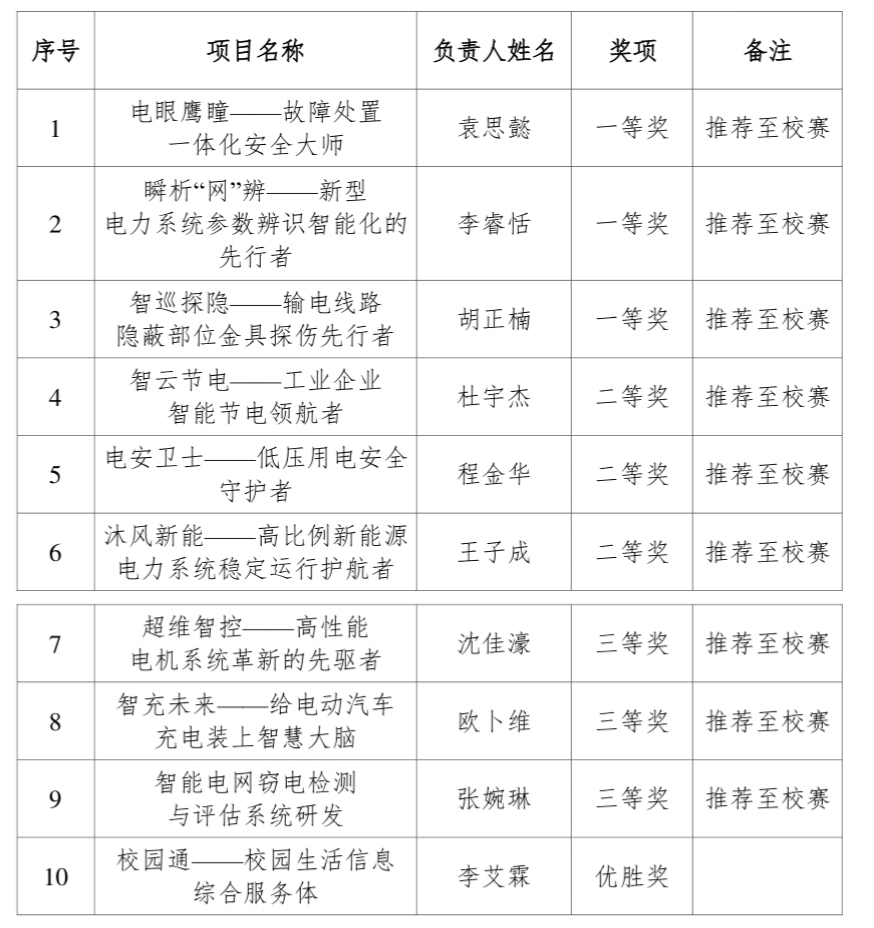 2025 年中国国际大学生创新大赛电气学院院赛已经结束,经评委 会评选审核,评选出 2025 年中国国际大学生创新大赛电气学院院赛获 奖名单,现将名单公示如下: