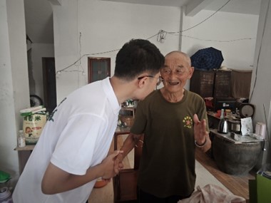 后续,实践队员们在桑植县洪家关乡拜访了92岁的抗美援朝老兵皮运琪。皮爷爷精神矍铄,热情展示国家颁发的“抗美援朝老兵”纪念拐杖。他带队员们走进珍藏记忆的房间,一张佩戴军功章的英姿照片格外醒目。老人珍重地从一个印有抗美援朝标志的布袋中,取出古朴木盒,里面珍藏着“抗美援朝出国作战70周年”和“光荣在党50年”两枚纪念章。佩戴上勋章,老人目光如炬,仿佛重回烽火岁月。