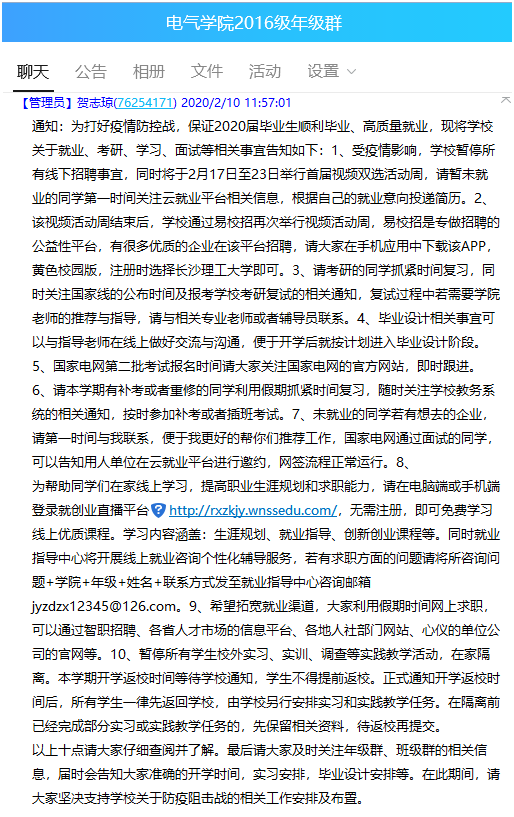 2月10日11点57分,他还在毕业生的QQ群里发布了一条长达1034个字的通知,全面详细地布置了网上求职、考研复试复习、国家电网招聘考试、补考重修、网上学习、毕业实习、毕业设计等工作,就是为了给焦虑中的毕业生一颗定心丸啊!(文/陈仁凯 图/陈仁凯 审/陈仁凯))