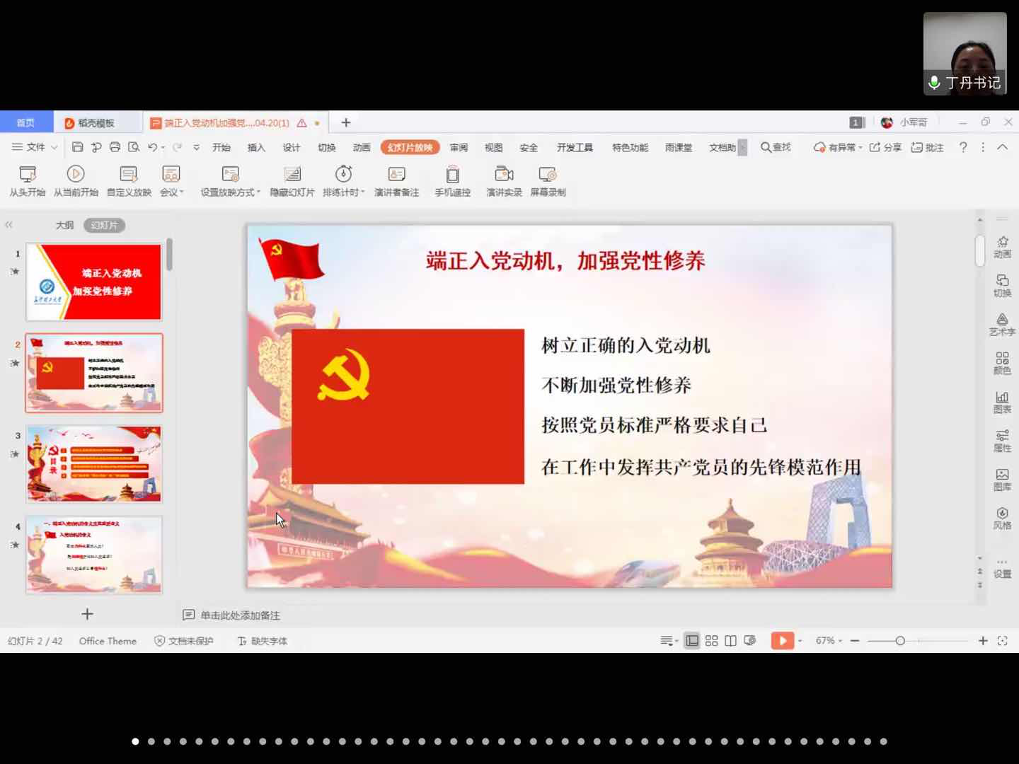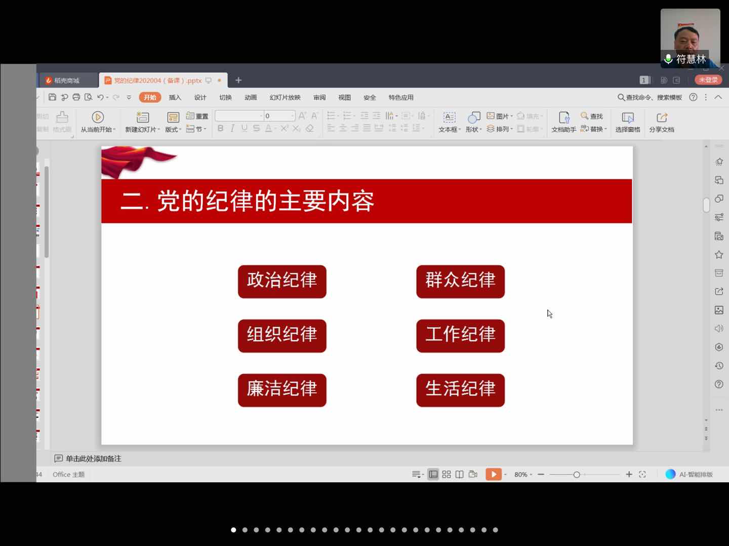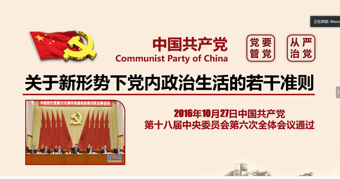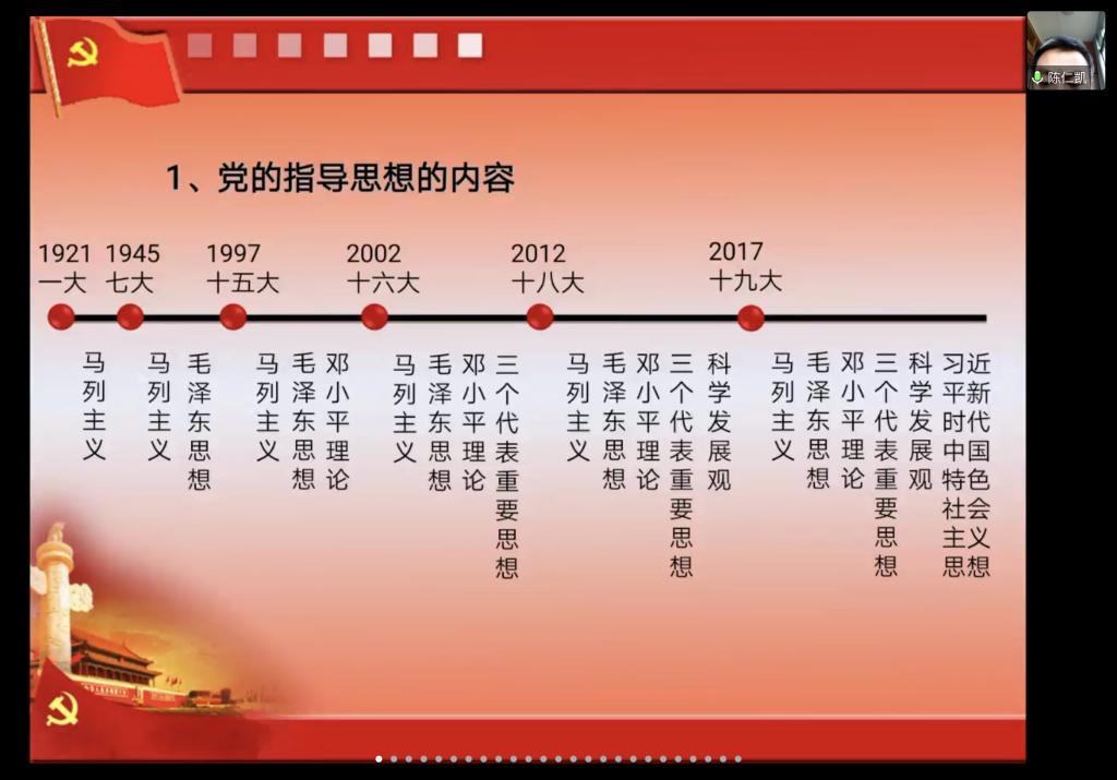 关于新形势下党内政治生活的若干准则》专题由校友联络专干甘为讲授。甘为准则、政治生活、新形势三个关键词《新准则》的背景进行介绍从坚定理想信念、坚持党的理想信念等12个方面对《新准则》的具体内容进行讲解强调作为一名学生党员发展对象要不断地加强学习、严格自律,不因为疫情在家而放弃自己的学习。