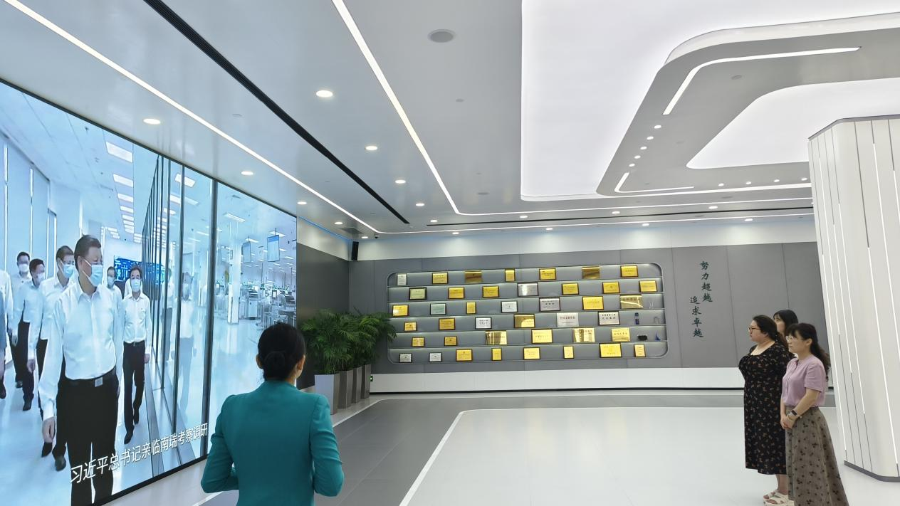 调研期间,王媛媛一行与国电南瑞变电公司华中工程部技术主管陈卫等领导进行了交流与讨论,参观了南瑞集团展厅,了解了南瑞集团长期以来取得的各项科研成果、设计与制造的各种高精尖产品以及遍布全球的各类工程项目。