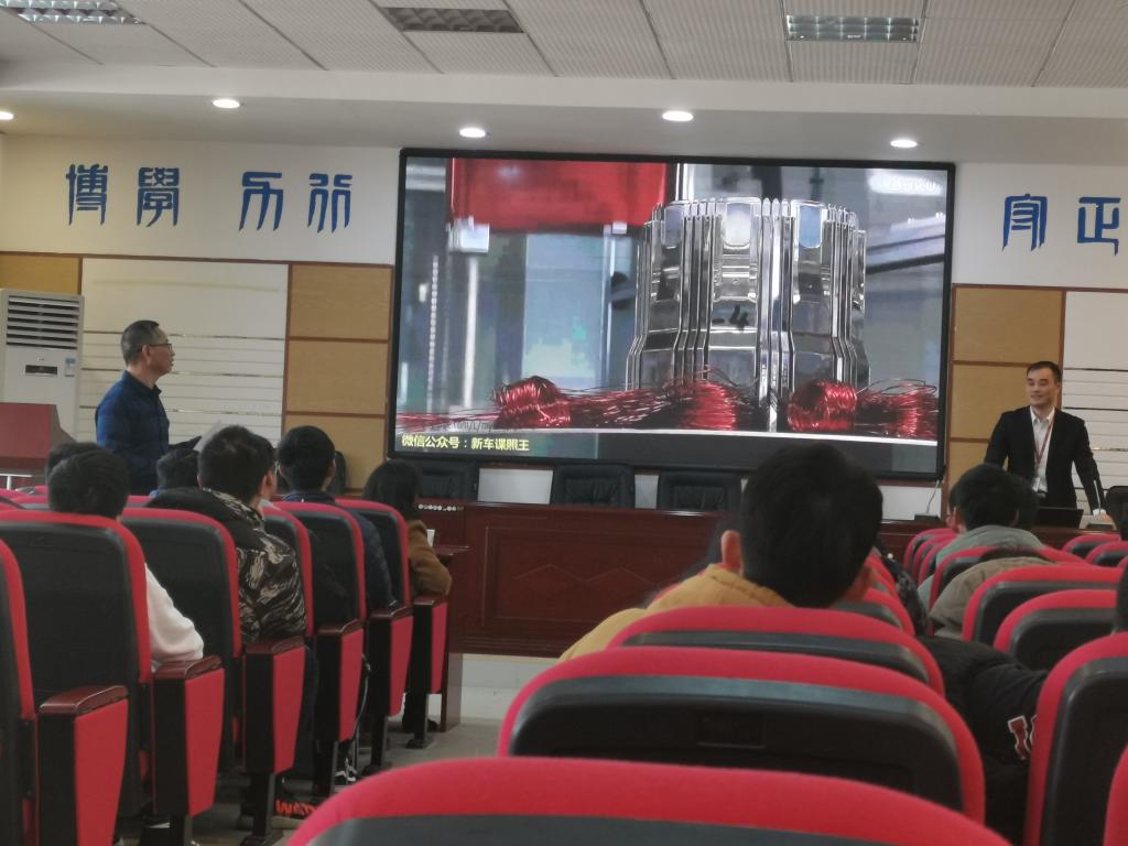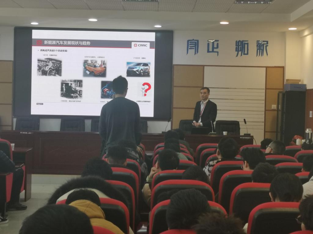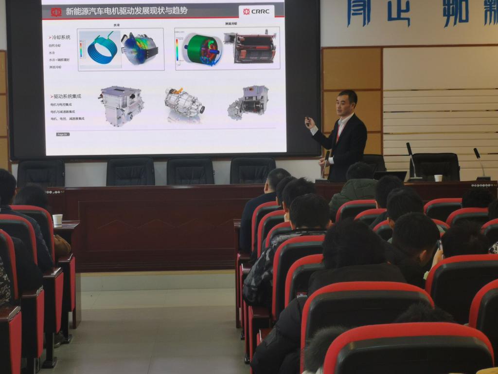 董高工向师生们阐述了新能源汽车驱动电机发展现状与趋势、新能源汽车的优点及国内外生产现状,重点对新能源汽车驱动电机关键技术进行了深入讲解和剖析,并对中车株洲电机有限公司的发展历程和研发能力做了介绍。