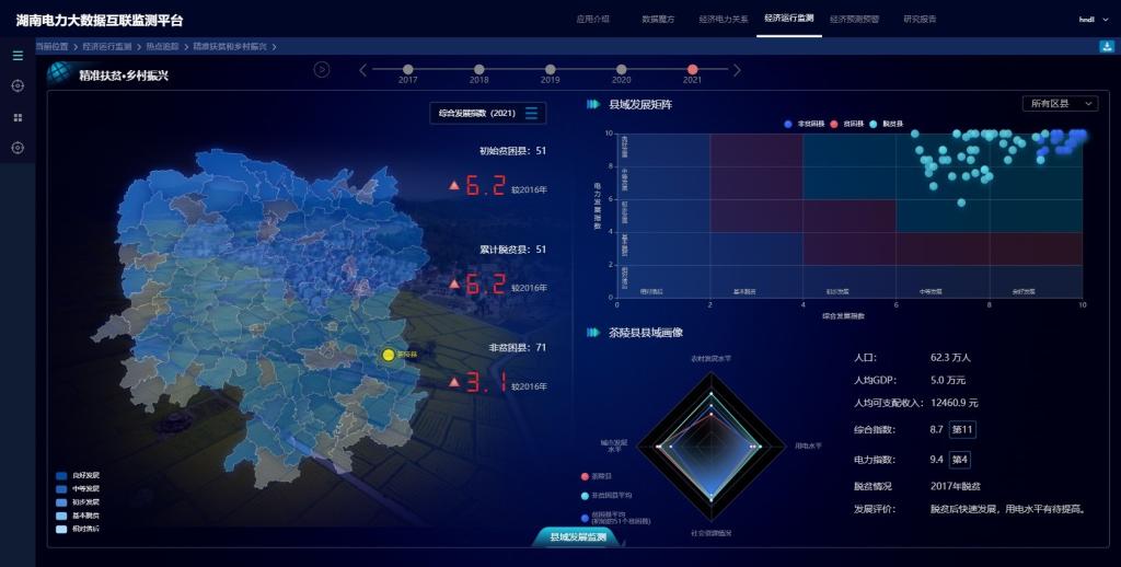实践团联合国网湖南省经济技术研究院成功打造电力看乡村振兴大数据云平台,平台由经济指数、特色小镇画像以及返贫风险预警三大模块构成,直观反应乡村用能整体情况,精准分析乡村各行业、配套产业发展趋势,全景图谱区域乡村振兴进程,为政府乡村振兴精准决策提供数据支撑。
