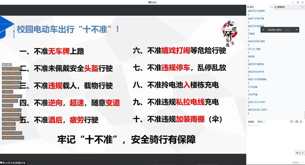 任艮丰从校园疫情防控以及校园交通安全两个方面为全体研究生解读相关政策,讲授安全知识,并强调“非必要不出校,非十分必要不离长”,要求全体研究生严格遵守疫情防控相关要求,积极配合防疫工作,同时在校内规范使用电动车,提高交通及充电安全意识。会议最后杨湘怡为全体研究生答疑解惑。