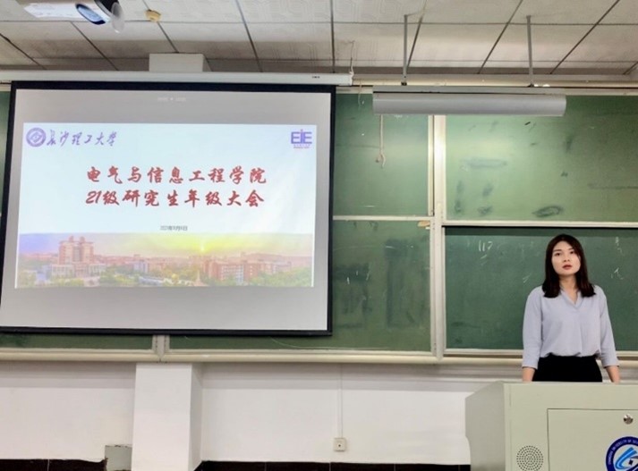96日下午18:00,电气学院在金盆岭校区12500召开电气学院召开2021级研究生新生见面会暨第一次年级大会。大会由研究生辅导员杨湘怡主持,电气学院研究生教育分管副院长王文、党委副书记任艮丰、学工办李晨璐和院研会骨干出席,全体2021级硕博研究生参会。