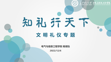 12月6日晚,电气学院开展“知礼行天下”文明礼仪专题线上讲座,由研究生辅导员杨湘怡主讲,电气学院2022级全体研究生参加。