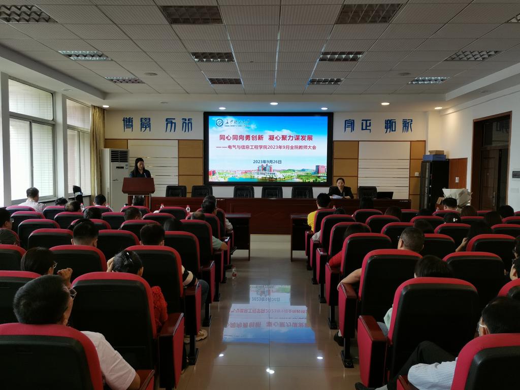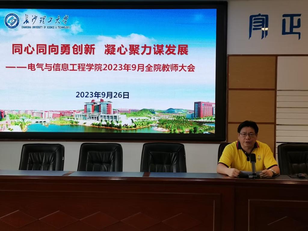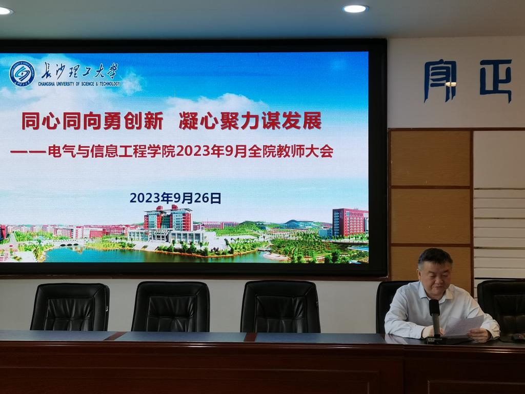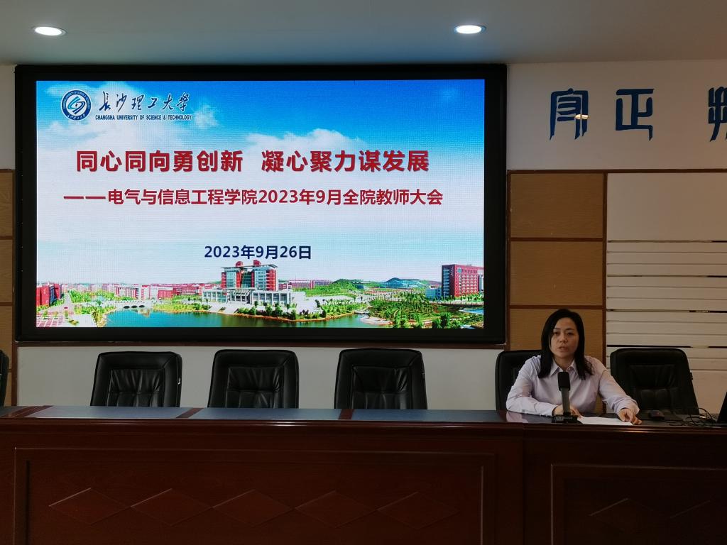 9月26日下午,学院在工一B503学术报告厅召开全院教职工大会。校党委委员、纪委书记徐桂林出席并讲话,组织部副部长李芳瑾宣布校党委决定:伍接朝同志调任基建处任处长,丁丹同志任电气与信息工程学院党委书记。