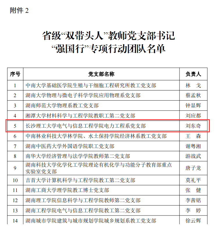 近日,中共湖南省委教育工委印发通知,公布了全国高校及省级“双带头人”教师党支部书记“强国行”专项行动团队名单。必赢官网入选全国及省级团队各一个。我院电力工程系党支部书记刘东奇同志被确定为省级“双带头人”教师党支部书记“强国行”专项行动团队。