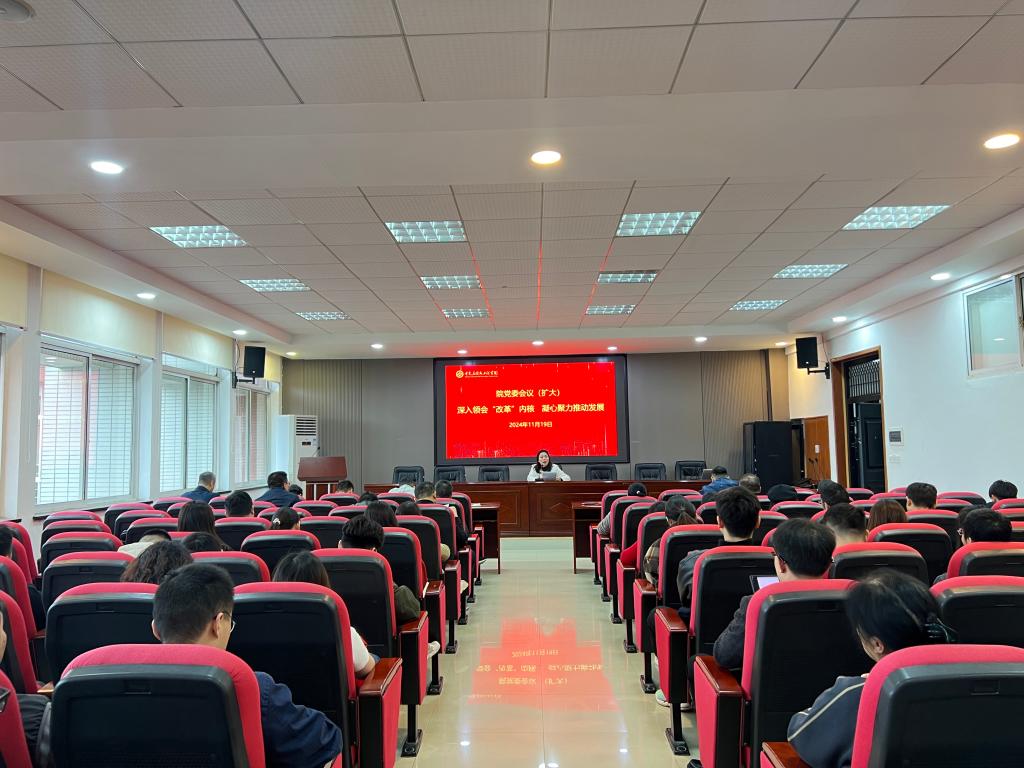 11月19日下午,在工一B503报告厅,院党委书记丁丹主持召开党委会议(扩大),并作《深入领会“改革”内核  凝心聚力推动发展》主题讲话。全体院领导、机关干部、系部负责人、教工党支部委员及教授委员会、学位委员会、近三年新进教师参加会议。