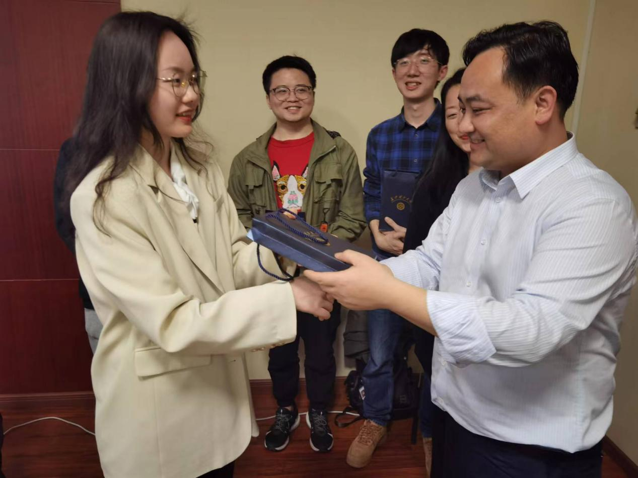 交流后,伍接朝给校友代表们赠送了学校的文创纪念品,向他们表示美好的祝福。