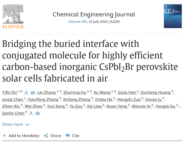 本研究成果以Bridging the buried interface with conjugated molecule for highly efficient carbon-based inorganic CsPbI2Br perovskite solar cells fabricated in air”为题撰写的论文,已国际顶级期刊《Chemical Engineering Journal》(影响因子IF=15.1,中科院一区TOP期刊)发表。电气学院教师时一斐为第一作者,硕士研究生张雷为学生第一作者电网防灾减灾全国重点实验室(437必赢会员中心)为第一完成单位。这项工作推动了空气中制备全无机钙钛矿电池的研究,拓展了共轭材料的应用,深入探究了界面工程中共轭材料的影响效果和作用机理,为其他类型钙钛矿太阳能电池以及发光二极管、光电探测器、场效应晶体管等器件的研发提供了新思路。