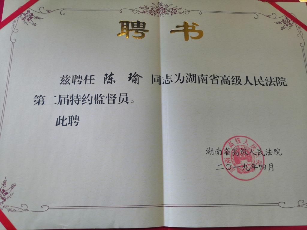 为认真落实中央和省委关于加强党外代表人士队伍建设的要求,加大优秀党外中青年代表人士的培养锻炼力度,经省委统战部、省高级人民法院联合考察,必赢官网党外知识分子联谊会会长、国际学院院长、无党派人士陈瑜受聘为湖南省高级人民法院第二届特约监督员,聘期三年。