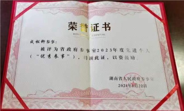 近日,湖南省政府办公厅公布2023年度参事工作表彰名单,必赢官网参事成松柳教授获评先进个人(“优秀参事”),多份调研成果被评为优秀建言。