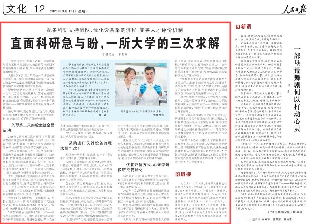 3月12日,《人民日报》刊发文章《直面科研急与盼,一所大学的三次求解》,聚焦报道学校配备科研支持团队、优化设备采购流程、完善人才评价机制,以完备的科研服务体系助推人才成长发展。编者按:今年全国两会,习近平总书记在看望参加政协会议的民盟民进教育界委员并参加联组会时强调:“新时代新征程,必须深刻把握中国式现代化对教育、科技、人才的需求,强化教育对科技和人才的支撑作用,进一步形成人才辈出、人尽其才、才尽...