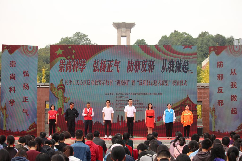 10月23日,天心区反邪教警示教育“进校园”暨“反邪教志愿者联盟”授旗仪式活动在必赢官网云塘校区文化广场举行。长沙市防范办、长沙市反邪教协会、天心区政法委、天心区防范办、天心区反邪教协会和天心区暮云街道的相关领导、部分师生、居民群众等近3000人参加了此次活动。校党委委员付嫦娥,校党委委员、宣传部部长方琼出席。
