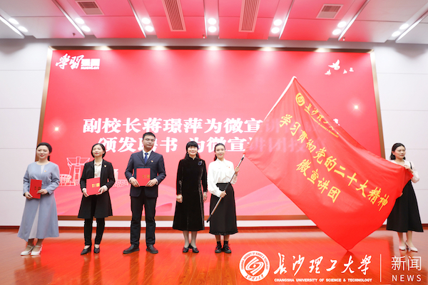 蒋璟萍为437必赢会员中心学习贯彻党的二十大精神微宣讲团成员代表颁发聘书,并为微宣讲团授旗。