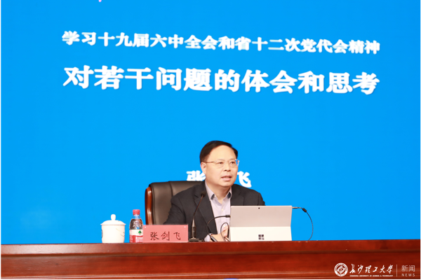 张剑飞在报告中指出,学习宣传贯彻落实党的十九届六中全会和湖南省第十二次党代会精神,是当前以及今后一个时期最重要的政治任务。他紧密结合党的十九届六中全会精神、湖南省第十二次党代会精神以及习近平总书记系列重要讲话精神,围绕当前国际国内形势,从如何正确认识国情、如何理性看待百年未有之大变局、如何深刻认识科技创新和工业化,如何把握碳达峰、碳中和的历史机遇和挑战等四个方面进行深入阐述。张剑飞用生动的语言,结合丰富的史实、扎实的案例、翔实的数据,对当前国际国内形势进行深入解读,对新时代党和国家事业取得的历史性成就、发生的历史性变革、获得的突破性进展进行了全面介绍。张剑飞勉励广大师生要始终坚持党的领导,牢固树立“四个自信”,做到“两个维护”,为实现第二个百年奋斗目标而不懈奋斗。