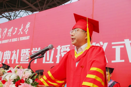 教师代表数学与统计学院谭艳祥向毕业生表达了母校老师们的衷心祝福,并以接续奋斗,报效国家为题向毕业生送上了初心做厚做实,把奋斗做深做精,把感恩做长做细的赠言。