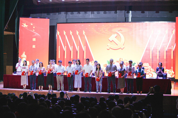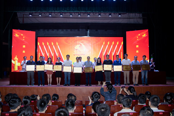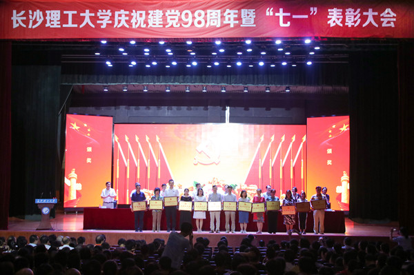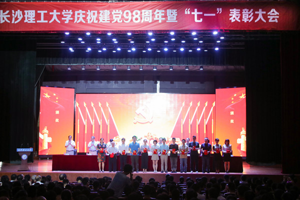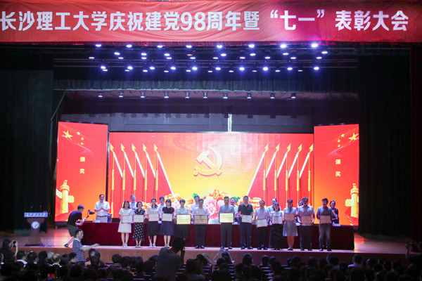 校领导为受表彰的集体和个人颁奖。汽车与机械工程学院党委被省委教育工委评为2018全省高校党建工作标杆院系,土木工程学院力学系党支部、化学与食品工程学院食品本科生党支部被评为2018年全省高校党建工作样板党支部。4名老师获评2018年全省高校教师党支部书记“双带头人”标兵、4人被评为2018年全省高校党务工作示范岗、2人被评为2018全省高校青年教工党员示范岗、4人被评为湖南省普通高校百佳大学生党员。4个先进党委(党总支)、54个先进党支部、34名优秀党支部书记、41名优秀党务工作者、9名优秀共产党员标兵、60名优秀共产党员受到学校党委的表彰。