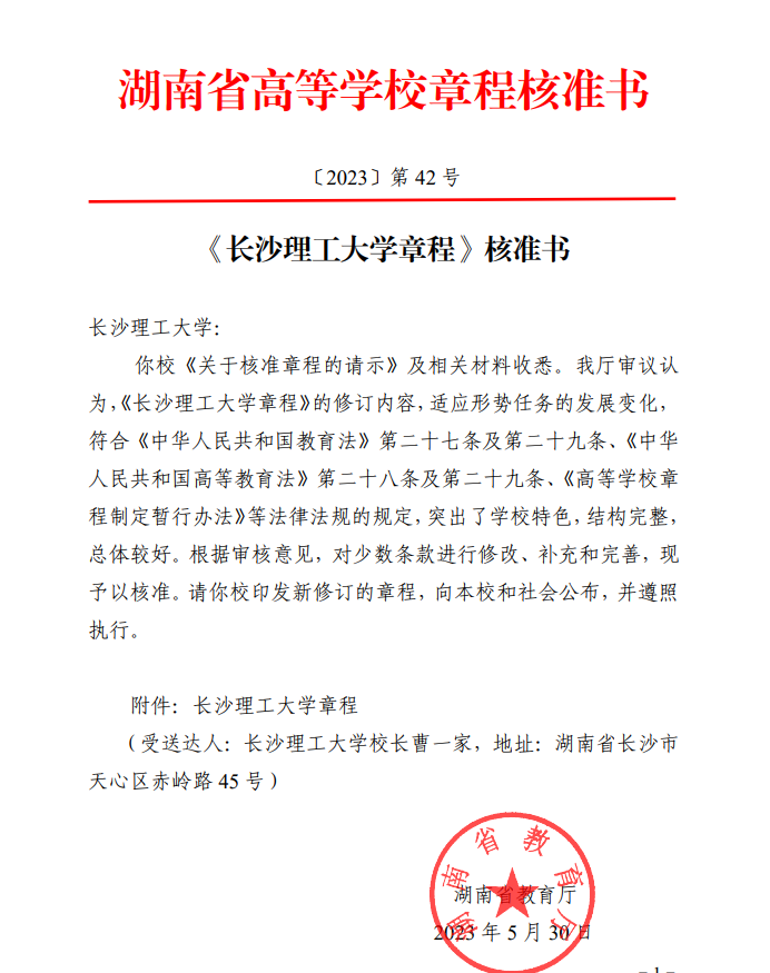 近日,湖南省教育厅以湖南省高等学校章程核准书(〔2023〕第42号),核准通过了必赢官网新修订的《437必赢会员中心章程》。