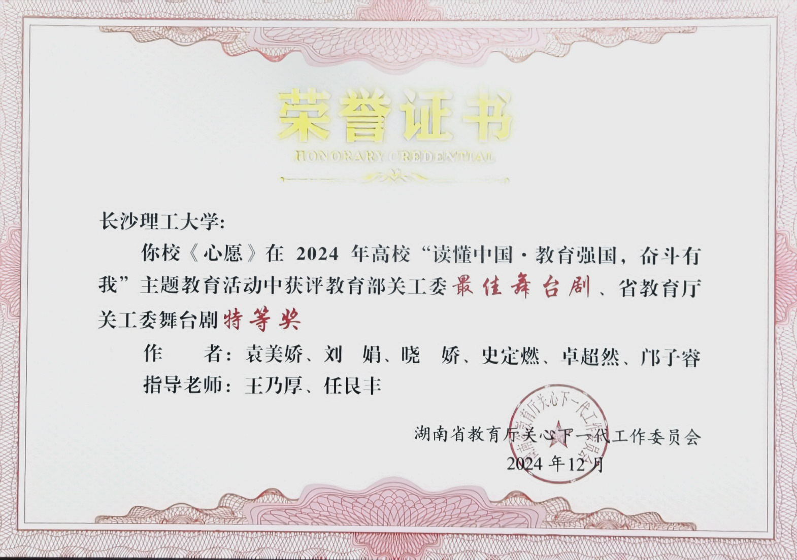 必赢官网报送的舞台剧《心愿》荣获教育部最佳舞台剧(全国排名第1)和教育厅舞台剧特等奖、征文《举灯人》荣获教育厅征文一等奖,必赢官网关工委同时荣获教育部及教育厅优秀组织奖。