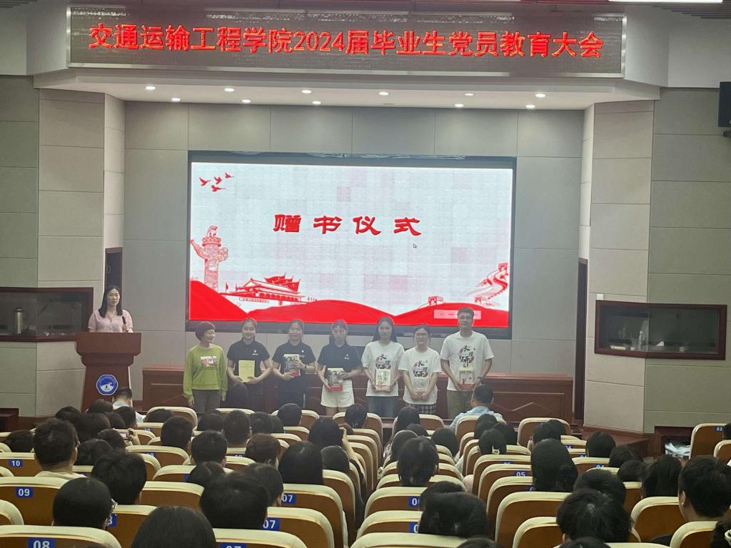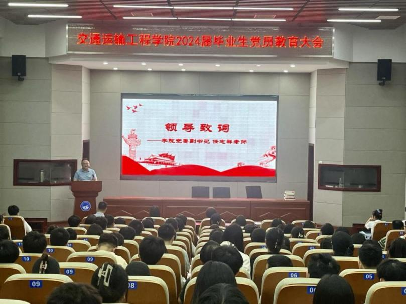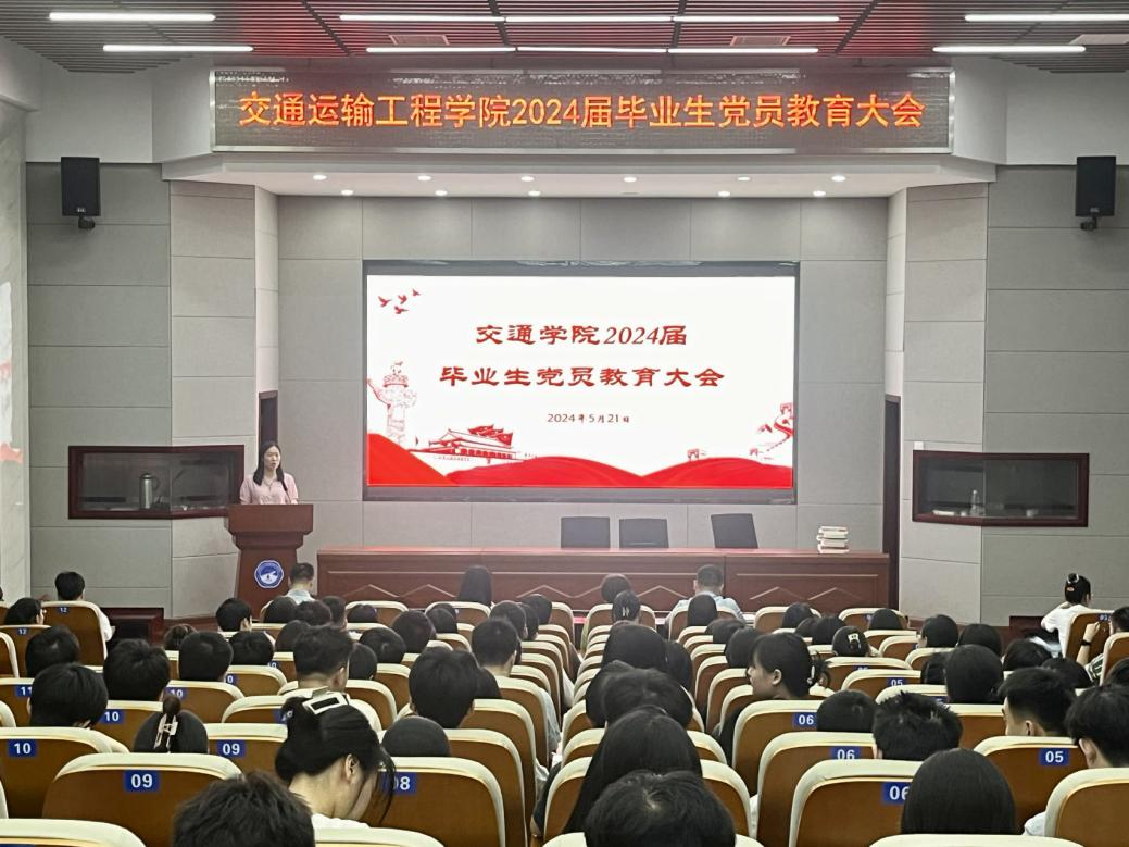 5月21日交通学院2024届毕业生党员教育大会在工二交通科技报告厅举行学院党委副书记任志祥、学院特邀党建组织员吴滨、研究生辅导员李文博、毕业生辅导员冯心崚及2024届全体毕业生党员参加建辅导员肖敏强主持