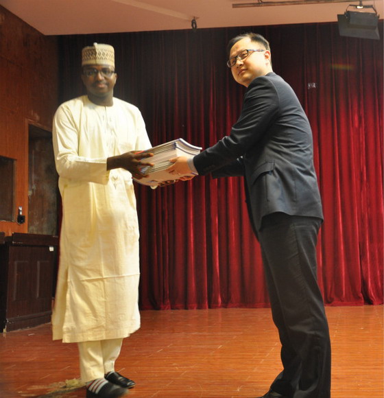 最后,吴迪龙代表必赢官网向尼方赠送300余册汉语教学用书,希望此次赠送的各类汉语书籍能进一步激发尼方民众学习汉语的热情,有助于尼日利亚汉语推广工作的开展。