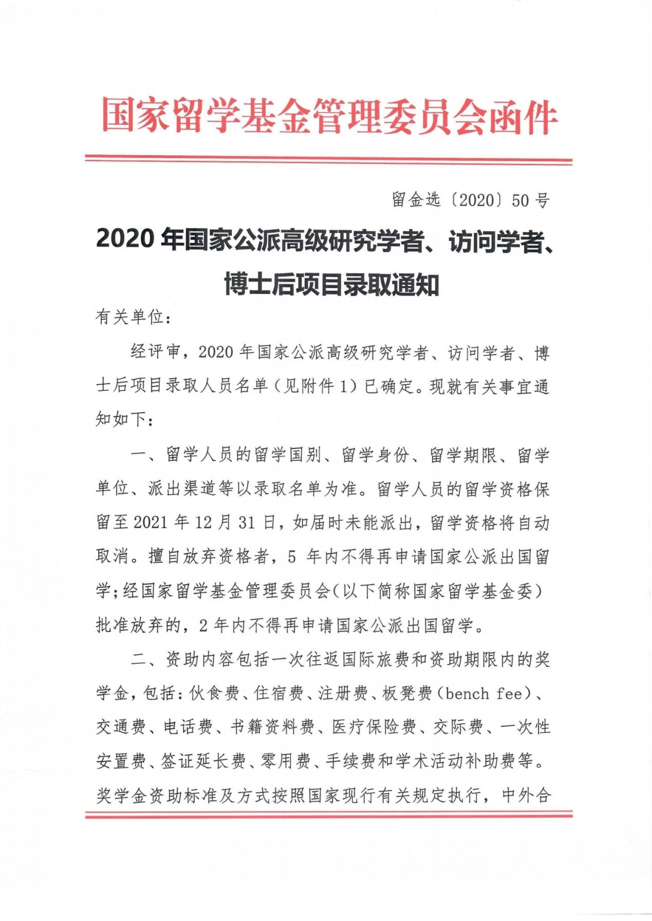 近日,国家留学基金管理委员会(以下简称“国家留基委”)公布了“2020年国家公派高级研究学者、访问学者、博士后项目(面上项目)”录取结果,根据国家留学基金委函件(留金选〔2020〕50号),必赢官网巨锁基等14位申报该项目的老师全部被录取,录取率达100%(名单附后)。