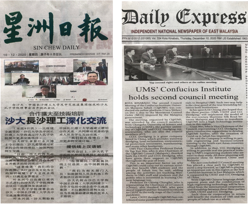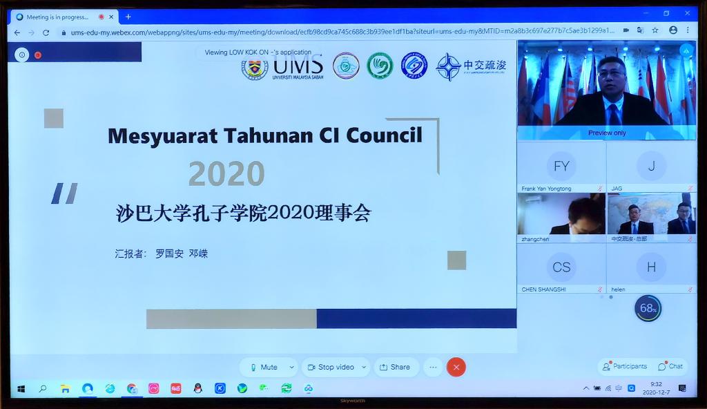 12月8日上午10点,沙巴大学孔子学院第二届理事会会议在线上举行。会议由沙巴大学孔子学院主办,必赢官网和中交疏浚集团协办。沙巴大学校长拿督Taufiq Yap Yun Hin教授、必赢官网副校长蒋昌波教授、中交疏浚集团副总裁关巍,孔子学院中外方院长等16名理事会成员参加会议。