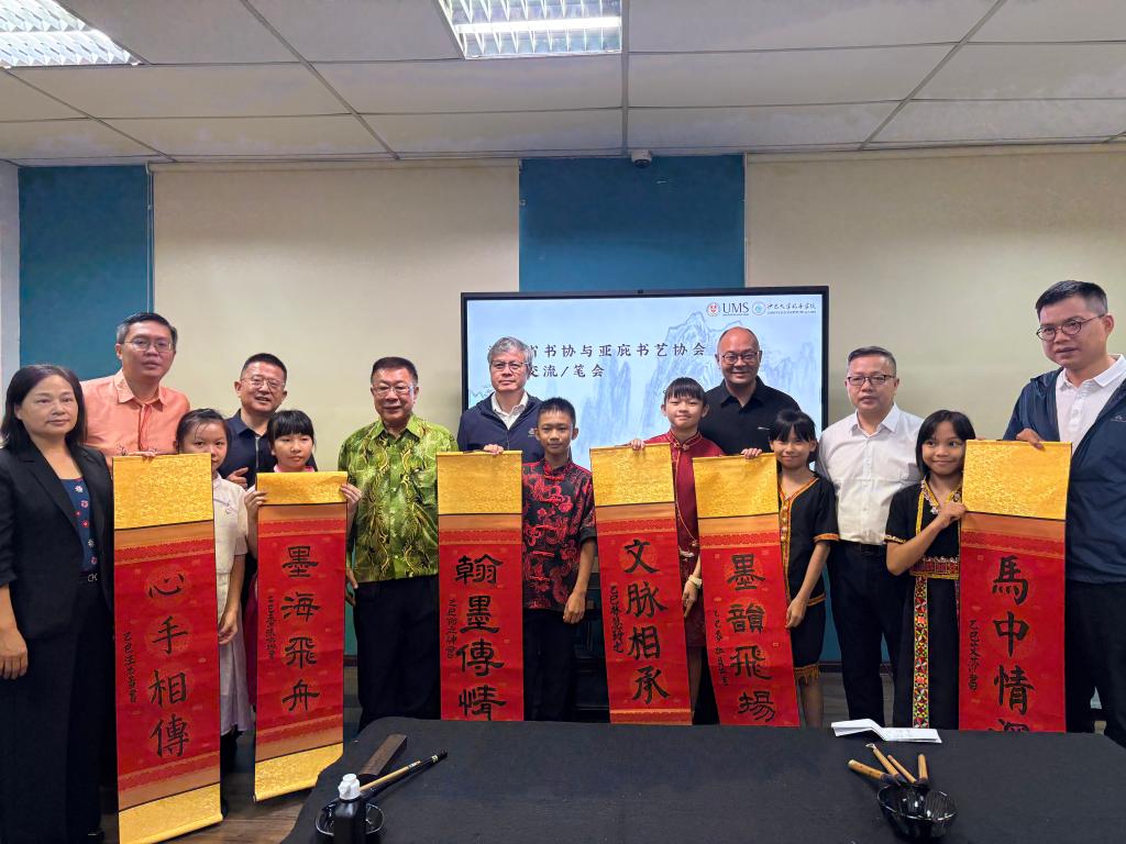 在为期四天的交流活动中,各方围绕书法艺术开展了深入互动:活动在必赢官网共建的沙巴大学孔子学院正式启动。湖南省文联党组成员、副主席、湖南省书法家协会副主席倪文华为孔院师生及当地书法爱好者带来了一场高水平的书法艺术专题讲座。讲座生动阐释了如何以思想力、审美力与实践力为核心来培养书法创作能力,反响热烈。交流团还前往沙巴亚庇书艺协会驻地,与该协会书法家及会员进行了深度的艺术切磋与交流座谈。双方就书法技艺、创作理念、文化传承等议题展开了热烈讨论,气氛融洽。交流团专程到访沙巴州书法教育模范学校——打里卜小学进行考察与教学示范。书法家们现场指导小学生习字,有效激发了孩子们对中华文化的兴趣。由沙巴亚庇书艺协会组织,两地书法家及众多书法爱好者共同举办了一场别开生面的联合笔会。在挥毫泼墨间,艺术家们以笔墨会友,情谊交融,将文化交流推向高潮。交流会上,“沙大孔院书法研创基地”在必赢官网沙巴大学孔子学院正式挂牌成立。该基地的设立,标志着两地书法艺术交流合作步入机制化、常态化新阶段。