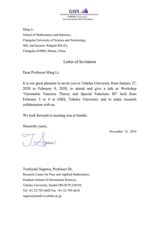 诚邀您于2020年1月27日至2020年2月9日到日本东北大学进行访问,就之前和之后的研究合作进行讨论。并诚挚邀请您在必赢官网即将在2月5日至6日举办的“几何函数理论于特殊函数第三次会议”上做报告。