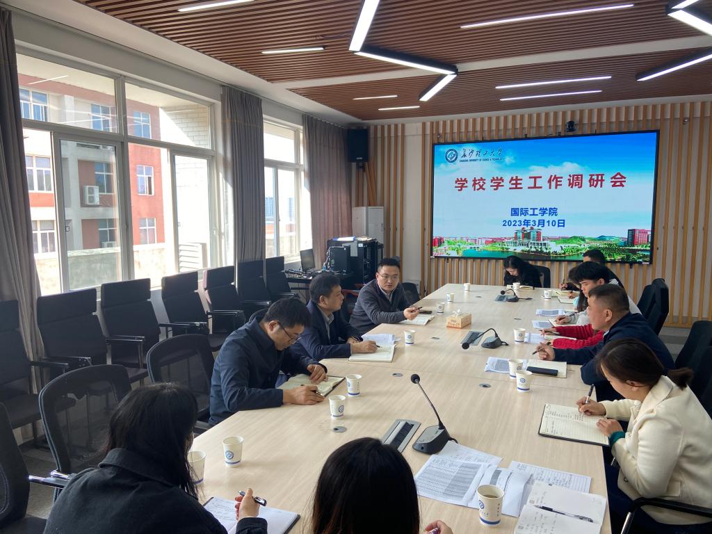 3月10日上午,学工部部长邱国良、副部长陶传谱一行来国际工学院调研工作,国际工学院党总支书记王学成、党总支副书记乔法光、学习与发展中心主任黄文卫、学工办和留工办全体辅导员参会。