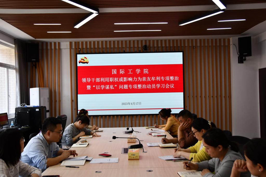 4月17日,国际工学院党召开了领导干部利用职权或影响力为亲友牟利专项整治暨“以学谋私”问题专项整治动员大会,会议由学院党总支书记王学成主持。