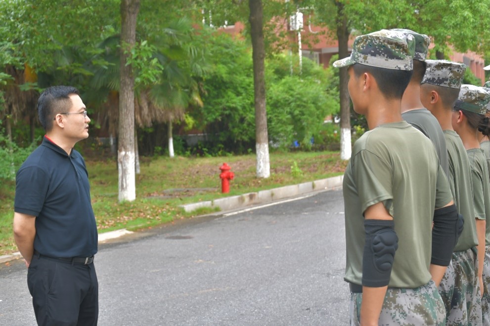 7月5日下午,437必赢会员中心国际工学院党委书记王学成前往云塘学生公寓17栋楼下训练场慰问正在紧张训练的民兵连教官,了解训练情况,并与承训教官进行亲切交谈。