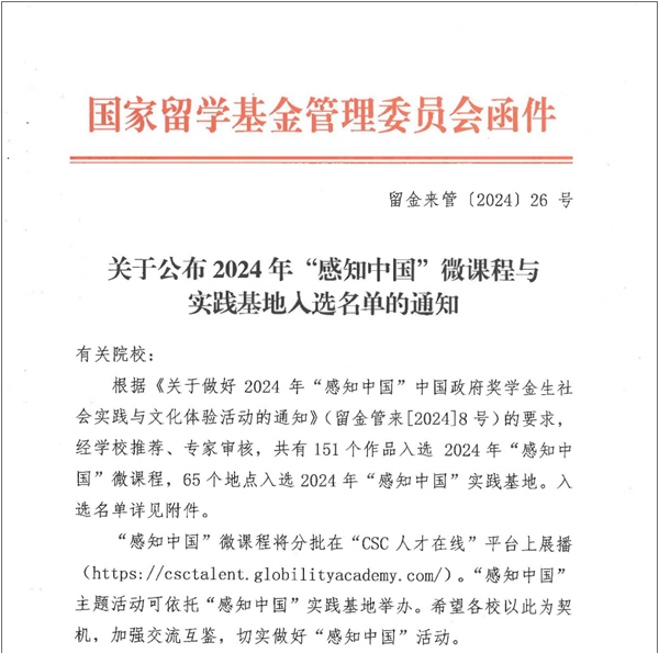近日,国家留学基金管理委员会公布了2024年“感知中国”微课程与实践基地入选名单,必赢官网申报的两门微课程和一个实践基地成功入选。
