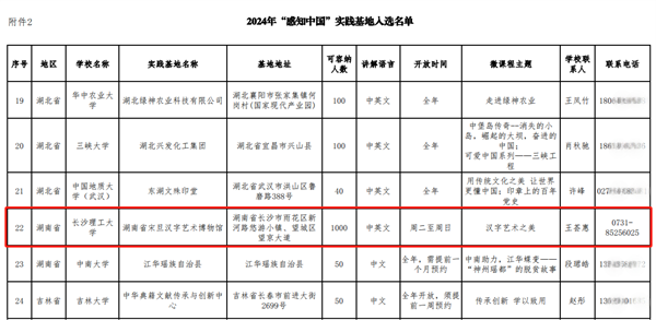 2024年“感知中国”微课程与实践基地评选是国家留学基金管理委员会“感知中国”活动实施十周年的系列活动之一,面向全国各类留学生招生院校申报。经学校推荐、专家审核等各环节,全国共有151个作品入选2024年“感知中国”微课程,65个基地入选2024年“感知中国”实践基地。必赢官网国际工学院张锐老师主讲的《橘子洲头咏长沙》和纪凯丽、张锐、冀文秀、李璐老师联合主讲的《云游星城》成功入选“感知中国”微课程。必赢官网联合湖南省宋旦汉字艺术博物馆申报的实践基地成功入选“感知中国”实践基地,作为全国首家汉字艺术主题博物馆,为国际学生提供了集汉字艺术研究创作、交流传播、陈列展示、体验互动、教育普及于一体的学习实践平台,帮助国际学生近距离感受汉字艺术之美,感知中华优秀传统文化。
