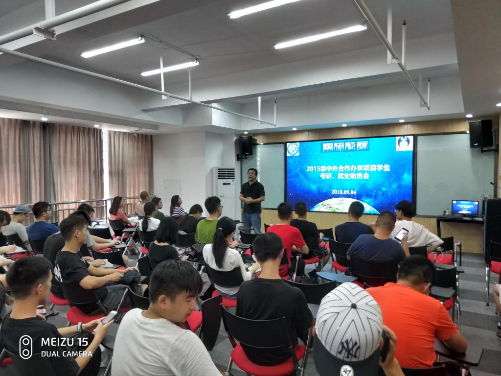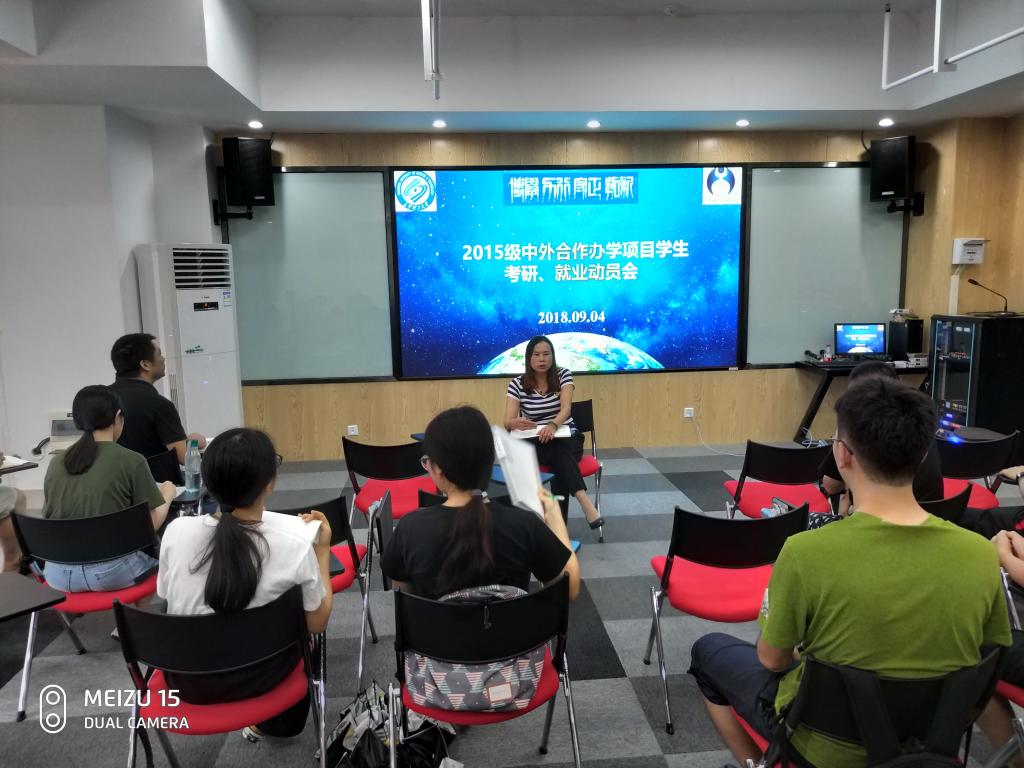 为进一步提高2015级中外合作办学项目学生考研、就业积极性和针对性,9月4日下午1点,国际学院在新能源大楼1栋4楼多功能报告厅召开2015级中外合作办学项目学生考研、就业动员会。国际学院党总支书记付嫦娥、副院长秦卫星、辅导员刘森峙和2015级全体学生参加会议,会议由副书记吴振华主持。