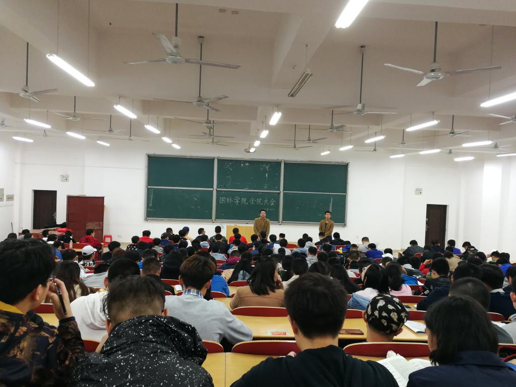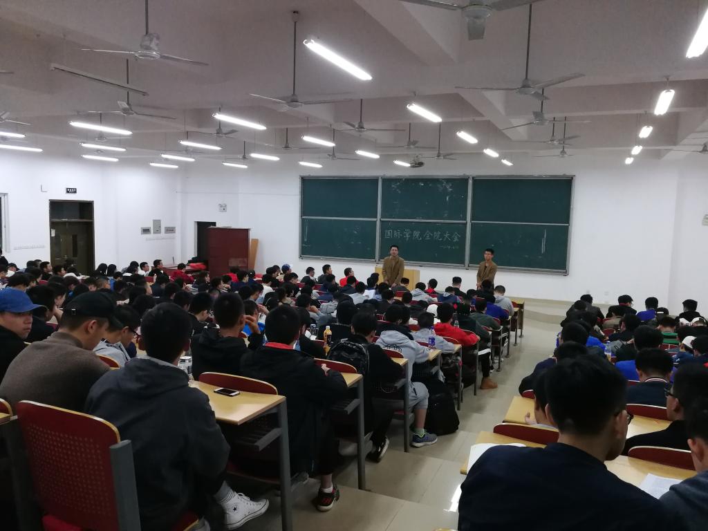 10月15日晚7点,国际学院在文科楼B-300召开教学审核评估工作全院学生再动员大会,学院党委副书记吴振华,辅导员刘森峙和全院15、16、17级全体学生参加会议。