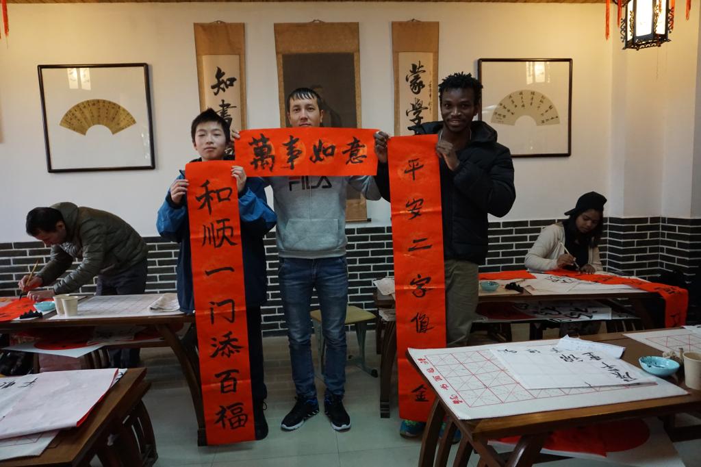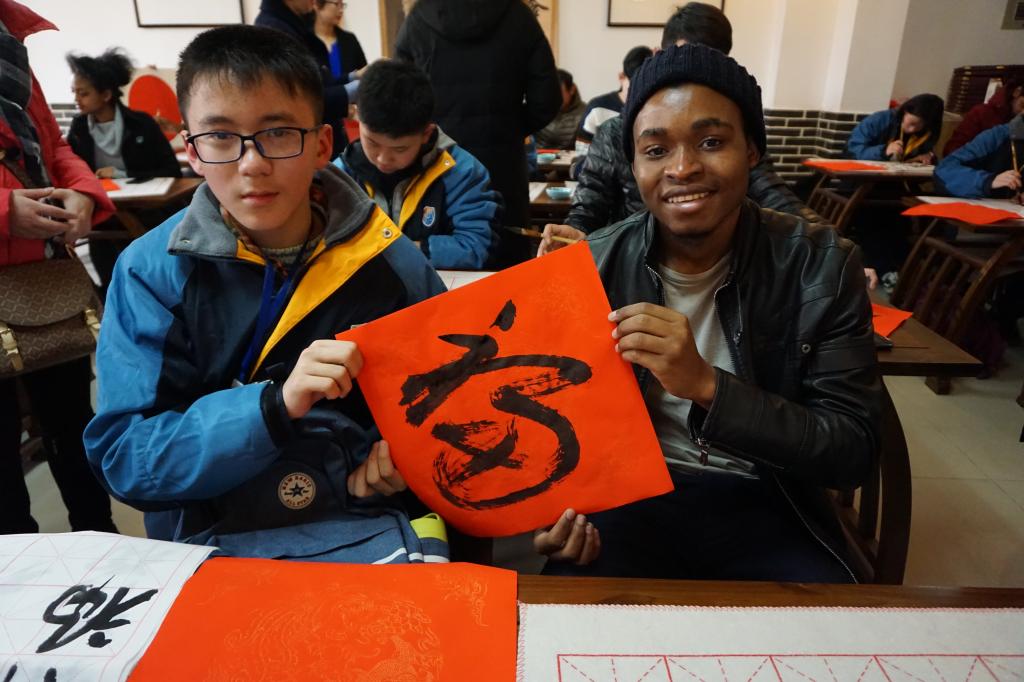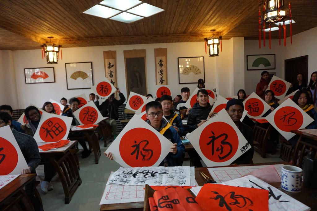 讲解结束后,同学们在校图书馆书法老师刘亮的带领下,分组完成毛笔字书写“福”字和新春对联。虽然很多留学生是第一次用毛笔,但经过老师的指导,一下子就掌握了要领,写得像模像样,令身边的中国小同学啧啧称赞。“梅传春信寒冬去,竹报平安好日来”、“狗年已展千重锦,猪岁再登百步楼”……同学们合作完成的一幅幅对联,表达了大家对于新年的期待和祝愿。