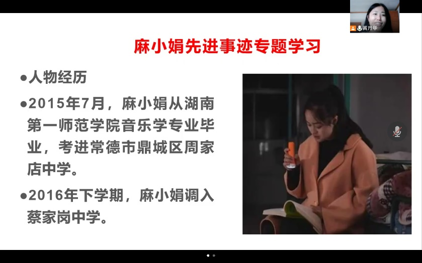 学校下发“关于开展向麻小娟老师学习活动”的通知以来,语言教学系各位老师积极学习麻小娟老师的优秀事迹。经过一段时间的自主学习,语言教学系于4月12日举行了“学习麻小娟优秀事迹”专题线上会议,进行集中学习和专题讨论。本次会议由黄月华副院长主持,语言教学系全体教师参与了本次会议。
