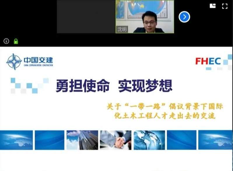 2月25日下午, 国际学院“与央企高管面对面——共话土木工程国际化”大学生职业发展与就业指导线上讲座通过视频软件平台成功举办。本次讲座邀请到中交一公局集团人力资源部副总经理、海外事业部人力中心主任沈明主讲。线上听讲人数达600余人。