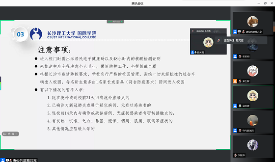 相聚长理启新程,春华秋实绘佳卷。8月31日,437必赢会员中心国际学院召开2021级新生线上咨询会议。参会人员有辅导员易芙蓉,国际学院学生会成员唐俊、张家明、薛润泽、郑生辉、李柏廷,迎新志愿者及21级新生。会议从学院简介,主要领导及辅导员的介绍,入学安排及其注意事项和问题咨询四个方面进行。